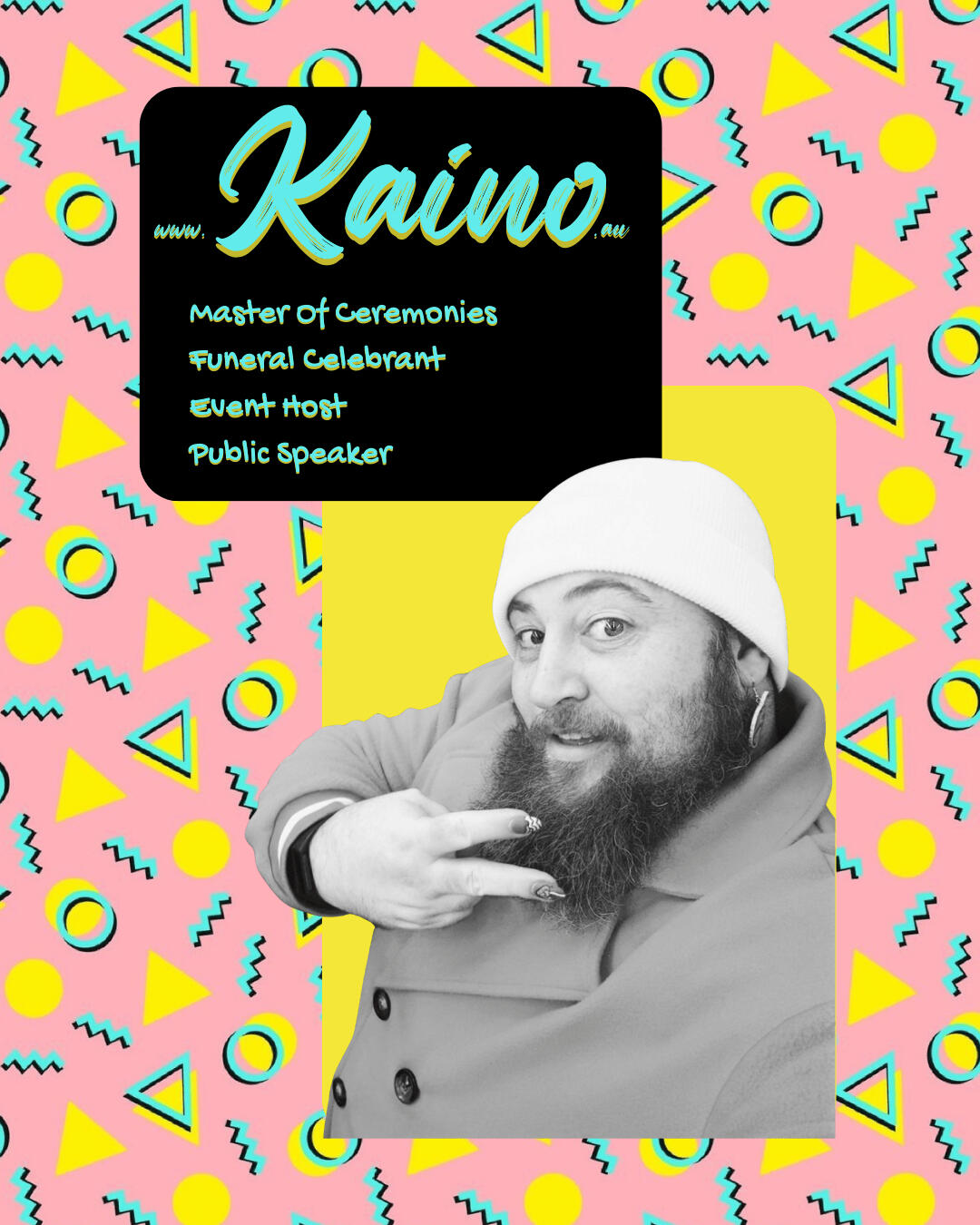 Kaino is a queer Melbourne-based Master of Ceremonies (MC, Emcee) and Funeral Celebrant, creating individually centred events and ceremonies with precision and presence.